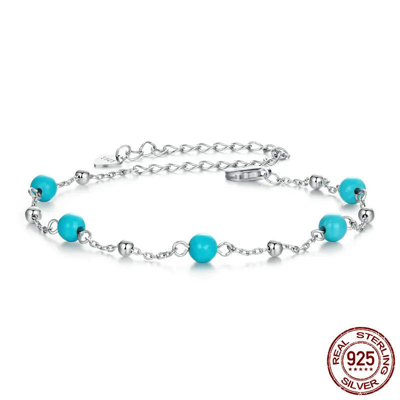 925 Sterling Silver Turquoise Beaded Bracelet Link Chain, White Gold Plated Dainty Handmade Jewelry Present for Women